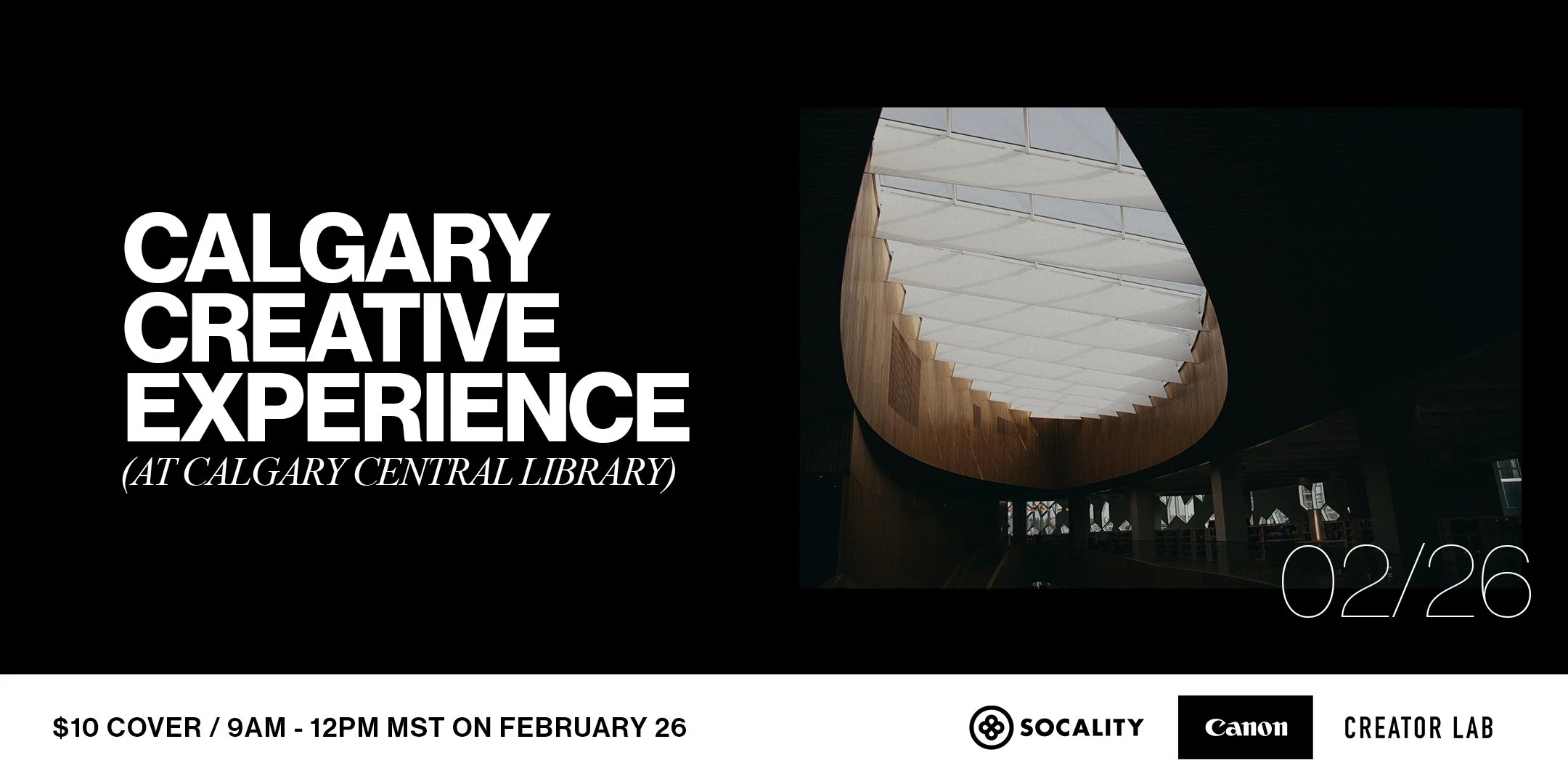 We're excited to announce a Socality x Canon Creator Lab creative experience at the Calgary Central Library in collaboration with The Camera Store. Join us on the morning of February 26th where you'll have the opportunity to connect and create with the local community. This private event will offer a unique opportunity to explore, capture, and create within this architectural masterpiece while it’s closed to the public. Light snacks and coffee will be provided.
