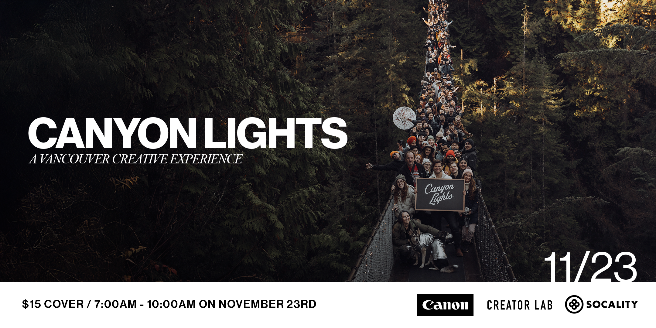 We're back for the popular Canyon Lights creative experience at the Capilano Suspension Bridge Park brought to you by Canon Creator Lab x Socality. Join us on the morning of November 23rd where you'll have the opportunity to connect with the local creative community. This private event will allow the community to connect and create together at the seasonal Canyon Lights before its regular operating hours. Canyon Lights brings spectacular light displays to the entire Park, including the famous Suspension Bridge, Treetops Adventure, and Cliffwalk. Your ticket will include coffee/tea and some light baked goods.