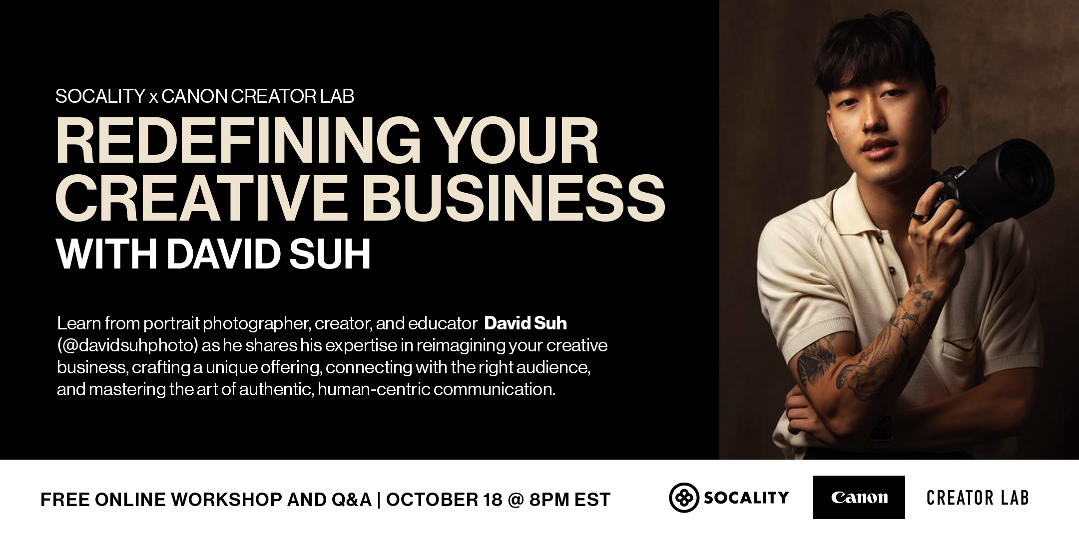 Join us on Wednesday, October 18th for an online Socality x Canon Creator Lab workshop and Q&A with David Suh (@davidsuhphoto), portrait photographer, content creator, and educator. In this session, David will share his expertise in reimagining business, discerning unique offerings, connecting with the right audience, and mastering the art of authentic, human-centric communication.