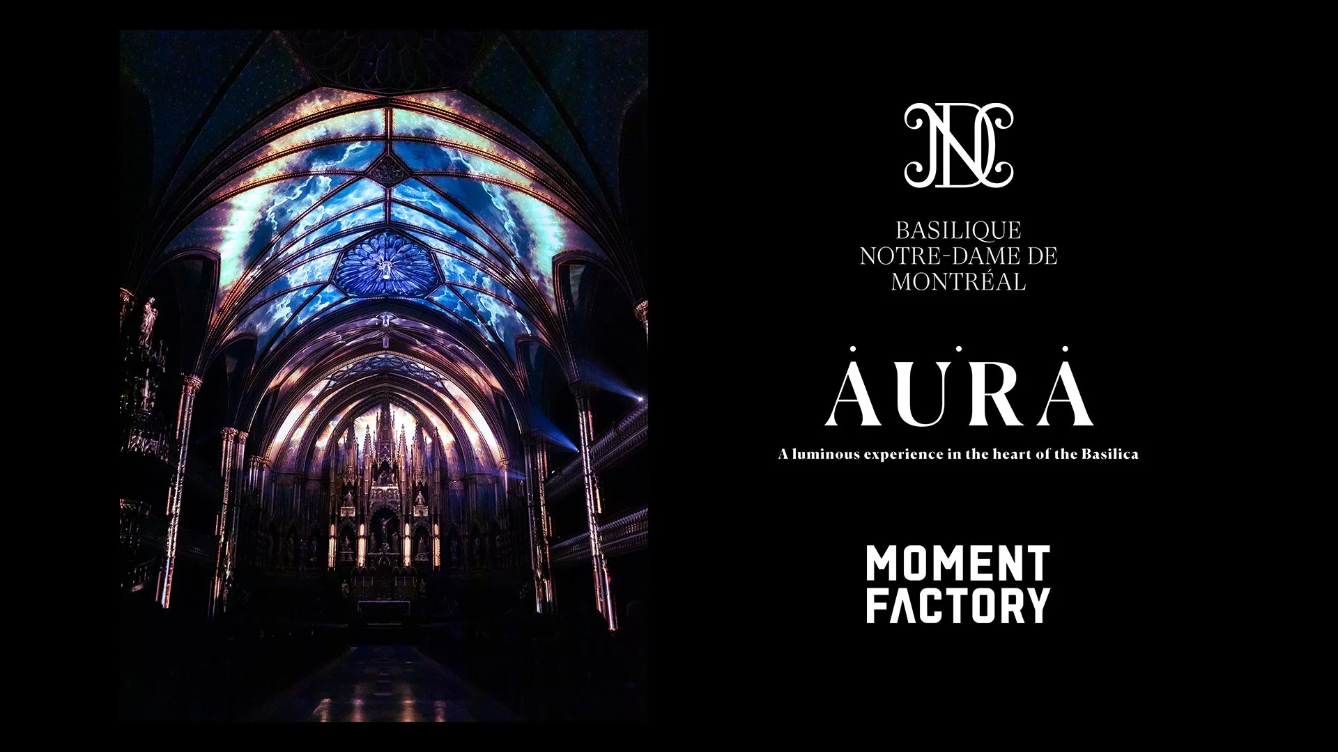 L'expérience AURA vous plongera dans un univers visuel et musical captivant, présenté sur l'une des toiles les plus sublimes qui puissent exister : l'intérieur de la Basilique Notre-Dame de Montréal, d'inspiration française et de style néo-gothique.