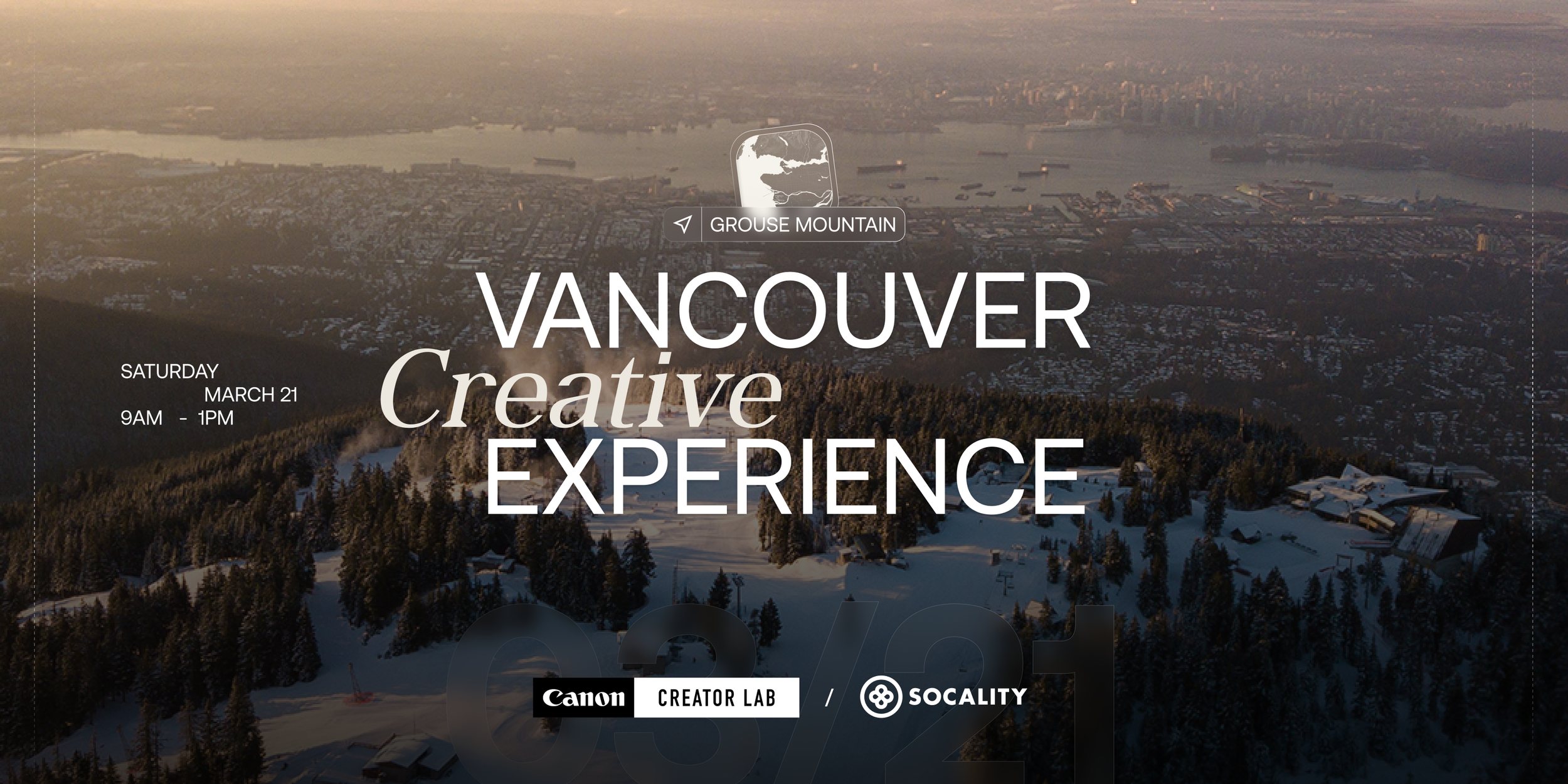 We’re excited to invite you to a special Vancouver Creative Experience at Grouse Mountain, brought to you by Canon Creator Lab and Socality. Join us on Saturday, March 21 for a wintery day of connection, creativity, and action, surrounded by the iconic alpine setting of Grouse Mountain Ski Resort.