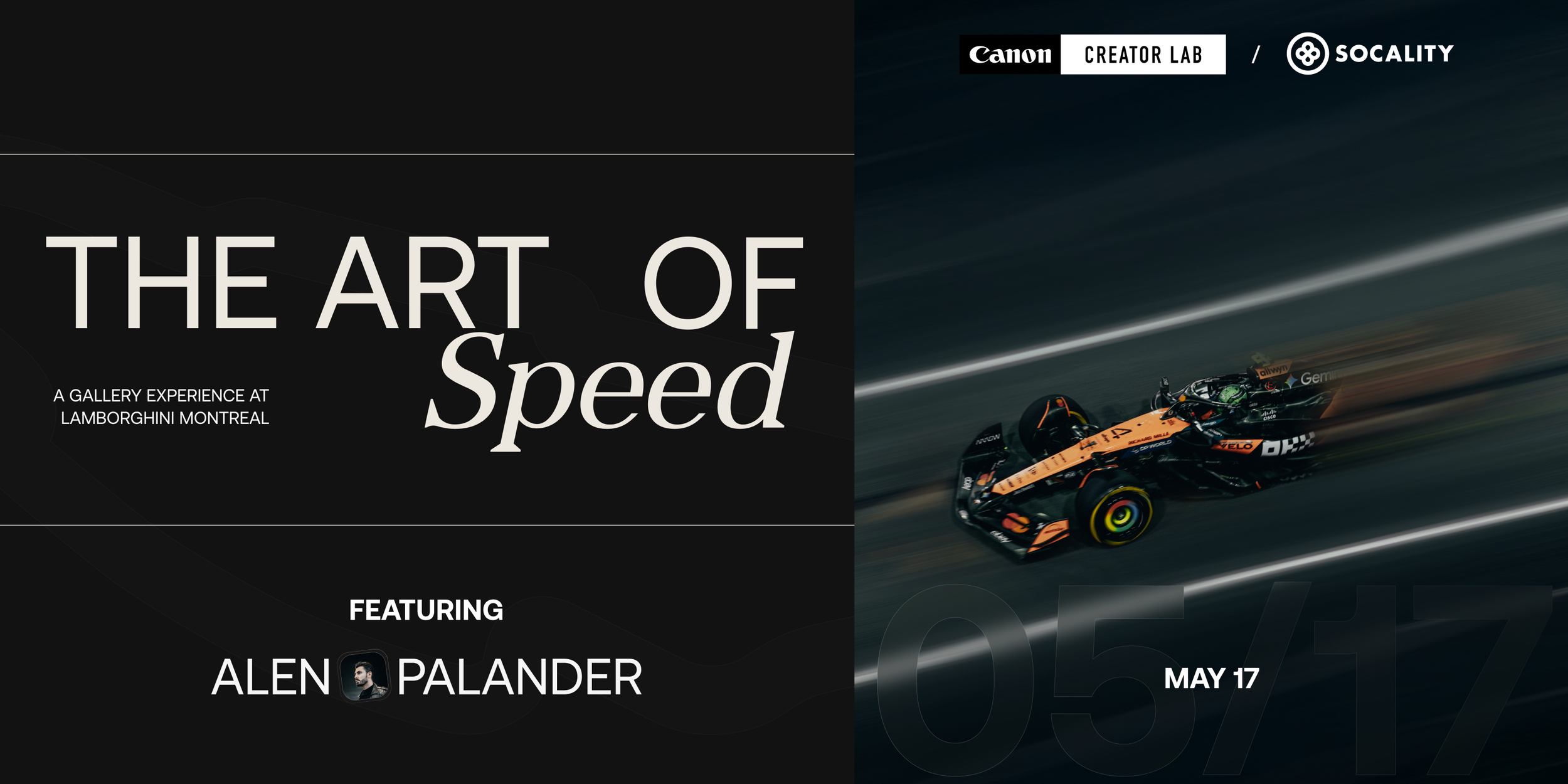 The gallery features the work of Alen Palander, a visionary Canadian automotive photographer whose imagery has defined what it looks like to capture the world’s most powerful cars at their top speeds. Alongside his work, the gallery will feature a curated spotlight of imagery from Montreal and Canon Creator Lab’s own creative community.