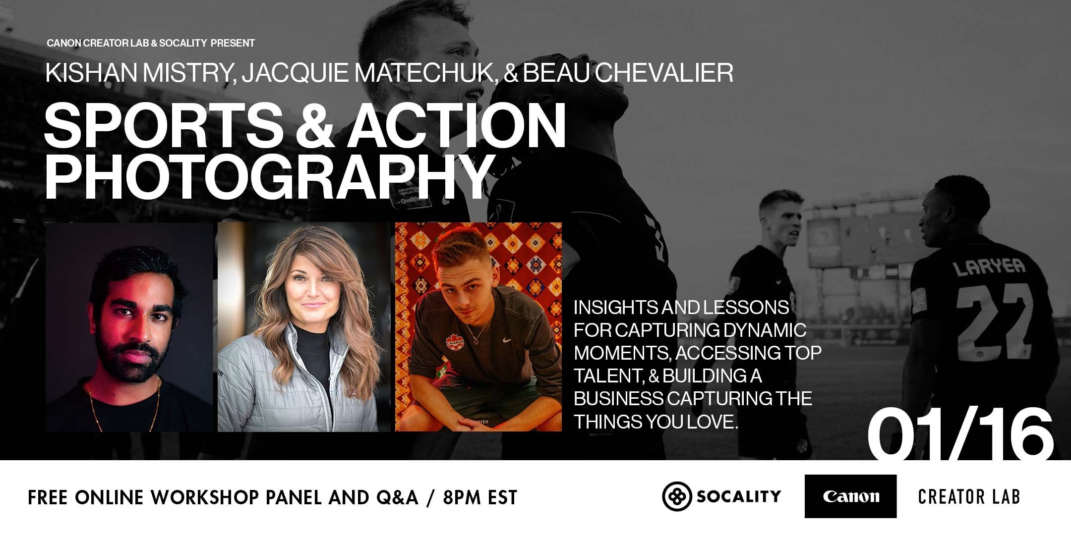 Join us on Monday, January 16th for an online Socality x Canon Creator Lab panel workshop and Q&A with sports and action photographers Kishan Mistry (@_kishanmistry), Jacquie Matechuk (@jacquiematechuk), and Beau Chevalier (@shotby.beau) as they share their insights into capturing "the moment", important tools and techniques, and how they've each built their own business around a capturing the things they love.